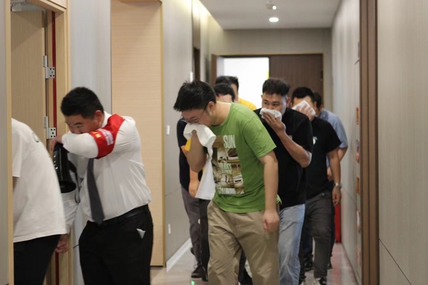 樓層內(nèi)各單位員工用濕毛巾捂住口鼻,以俯身姿勢(shì)聽從疏散小組的安排緊張有序地從疏散樓梯內(nèi)側(cè)往樓下撤離。